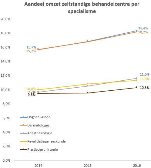 Bij oogheelkunde is het aandeel van zelfstandige behandelcentra in 2016 met 18,4% oftewel een bedrag van 117 miljoen euro het grootste. Daarna volgen dermatologie met 18,2% (70 miljoen), anesthesiologie met 11,6% (23 miljoen), revalidatiegeneeskunde met 11,3% (79 miljoen) en plastische chirurgie met 10,3% (32 miljoen).
