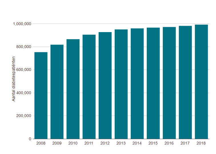 Uit declaratiedata van Vektis blijkt dat 1 op de 17 Nederlanders diabetes heeft. Dat aantal is de afgelopen jaren flink gegroeid, van ruim 750 duizend in 2008, tot ruim 991 duizend in 2018 [1]. 90% van de mensen met diabetes heeft diabetes type 2, ook wel ouderdomsdiabetes genoemd. In de figuur hieronder zie je het aantal mensen met diabetes door de jaren heen.