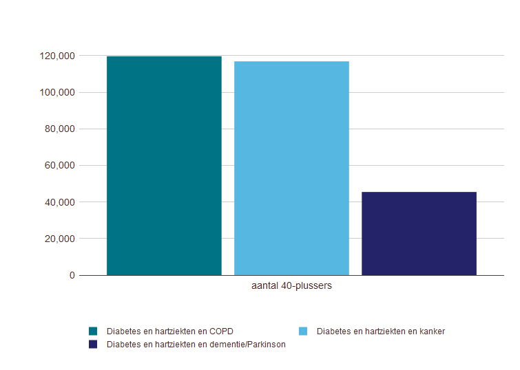 Hoe ouder iemand wordt, des te vaker men met 1 of meerdere chronische aandoening(en) te maken krijgt. Mensen met diabetes hebben dan ook vaak een 2e of 3e chronische aandoening. De combinatie diabetes, hart- en vaatziekten en COPD/astma komt het meest voor onder 40-plussers (120 duizend). Daarna volgt de combinatie diabetes, hart- en vaatziekten en kanker (117 duizend).