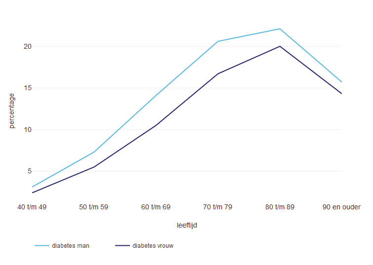 We zien dat vrouwen iets vaker een chronische aandoening hebben dan mannen. Diabetes is de uitzondering hierop en komt relatief gezien vaker voor bij mannen dan bij vrouwen. Vooral vanaf het 50ste levensjaar stijgt het percentage mannen met diabetes harder dan het percentage vrouwen.
