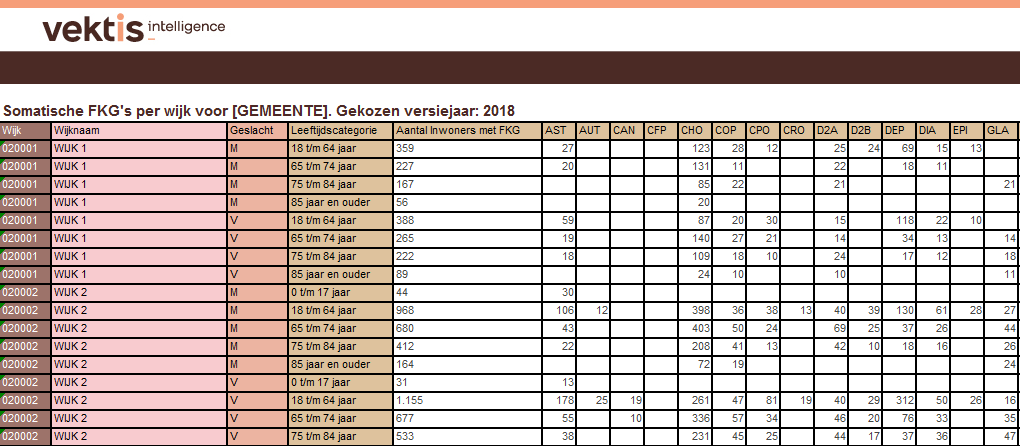In de Gemeentezorgspiegel bieden we die FKG’s ook op wijkniveau aan. Dit rapport biedt per jaar, per wijk het aantal mensen uitgesplitst naar leeftijd, geslacht en FKG (zowel somatisch als voor de ggz). Deze overzichten sluiten aan bij het landelijke verdeelmodel. Met de gegevens kan een gemeente het verdelen van de Wmo-gelden vereenvoudigen en de middelen verdelen op basis van objectieve criteria. In dit artikel gaan we daar dieper op in.