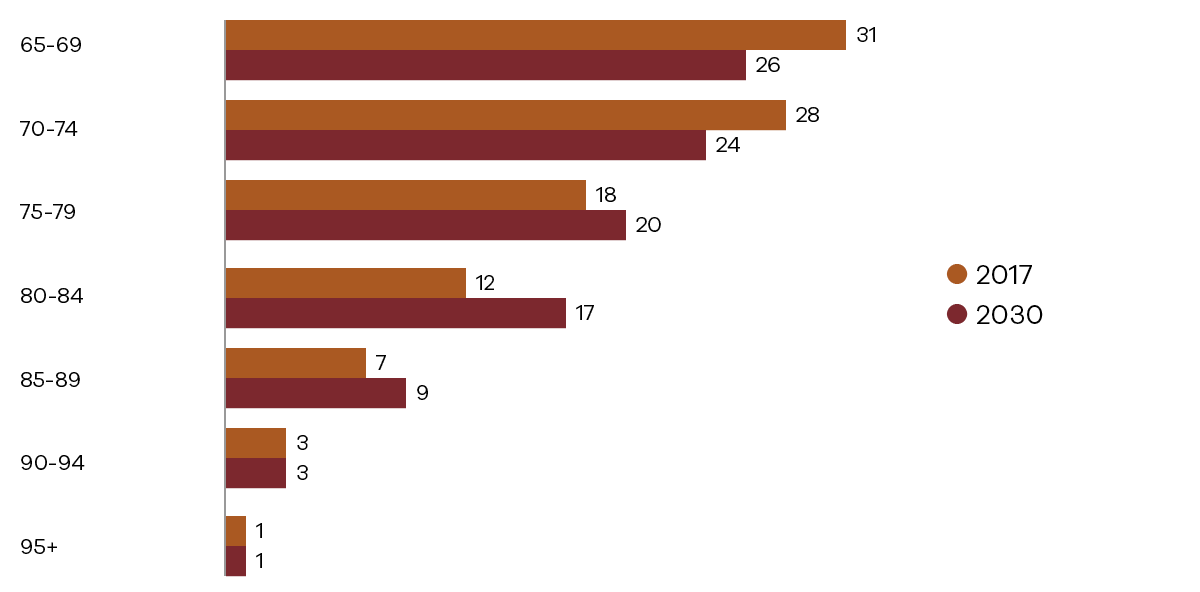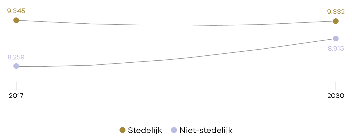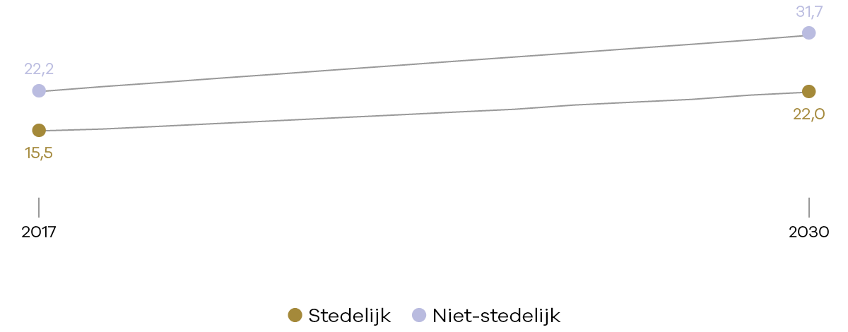 Het aandeel ouderen ten opzichte van de totale bevolking in de niet-stedelijke gebieden is in 2017 relatief groter dan in de stedelijke gebieden. Figuur 2 toont dat dit verschil met sterk stedelijk gebied tot 2030 verder toeneemt.