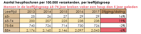 Tegelijkertijd zien we dat ‘oudere ouderen’, de 85-plussers, minder vaak een heup breken dan 5 jaar geleden. In 2013 tellen we 2.176 gebroken heupen in die leeftijdsgroep, tegenover 2.043 per 100.000 verzekerden in 2017.