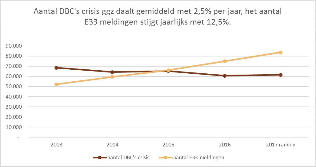 Het aantal meldingen van personen met verward gedrag, bij de politie geregistreerd als E33-meldingen, neemt jaarlijks toe. Het gemiddelde groeipercentage per jaar is 12,5%.