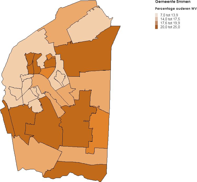 Binnen deze gemeentes verschilt het percentage ouderen dat in 2017 wijkverpleging ontving per wijk. Zo ligt het laagste percentage ouderen dat gebruik heeft gemaakt in Almelo in de wijk Windmolenbroek (13,3%) en het hoogste percentage in de wijk Hofkamp (24,6%). In Emmen varieert dit percentage van 7,8% in de wijk Parc Sandur en 24,3% in de wijk Emmen-Centrum Oost. Ook Heerlen laat een variatie zien van 12,2% in de wijk De Koumen en 23,3% in de wijk Heerlerheid-Passart.