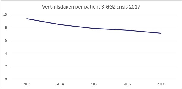 In 2017 is de gemiddelde verblijfsduur bij een crisis 7 dagen. In 2013 was dat nog ruim 9 dagen. We kijken naar het aantal dagen dat iemand wordt opgenomen in de eerste 28 dagen vanaf de crisis.