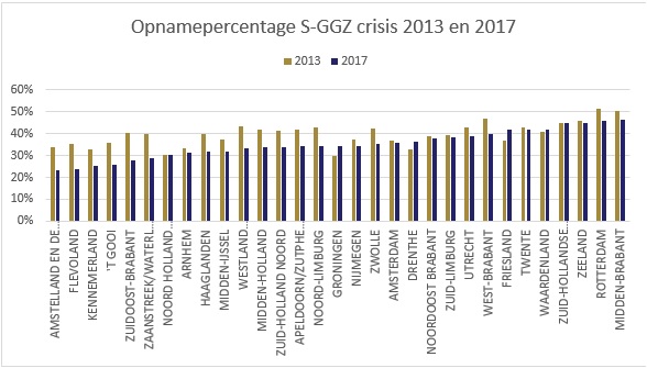 Opnamepercentage voor S-ggz crisis voor 2013 en 2017 per zorgkantoorregio.