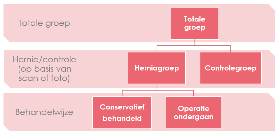 Onze onderzoekspopulatie bestond naast tienduizenden herniapatiënten uit een even grote controlepopulatie. Van de patiënten met een lage rughernia is ongeveer 20% geopereerd (zie figuur). Hier blijkt ook het grote voordeel van dit soort onderzoek ten opzichte van zelf nieuwe data verzamelen: je beschikt over grote populaties, zodat je er betrouwbare uitspraken over kunt doen.