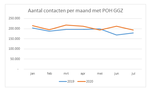 In 2020 zochten mensen meer hulp bij de POH-GGZ dan in 2019. In januari – februari 2020 waren er 5% meer contacten dan in dezelfde maanden in 2019. In maart- juli was er een toename van bijna 10%.
