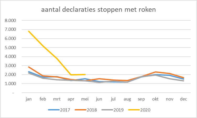 Per persoon wordt maximaal 1 programma vergoed om te stoppen met roken met hulp van de huisarts. De voorlopige cijfers over de periode januari tot en met mei 2020 geven aan dat het in totaal om bijna 20 duizend mensen gaat. Ter vergelijking: in heel 2019 waren er iets meer dan 18 duizend stoppers die hulp zochten.