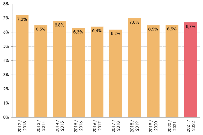 Tussen 2021 en 2022 zijn 1,2 miljoen verzekerden gewisseld van zorgverzekeraar, zo blijkt uit onze cijfers. Dat is 6,7% van de verzekerden. Het overstapcijfer komt daarmee iets hoger uit dan vorig jaar (6,5%). Het overstappercentage schommelt al jaren tussen 6 en 7.
