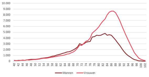 Dementie komt veel vaker voor bij vrouwen: 60% van de dementiepopulatie is vrouw, 40% is man. In absolute aantallen zien we een piek in het aantal mensen met dementie op 86 jaar. Ruim 13 duizend 86-jarigen hebben dementie, dit is 22% van het totaal aantal mensen van die leeftijd.
